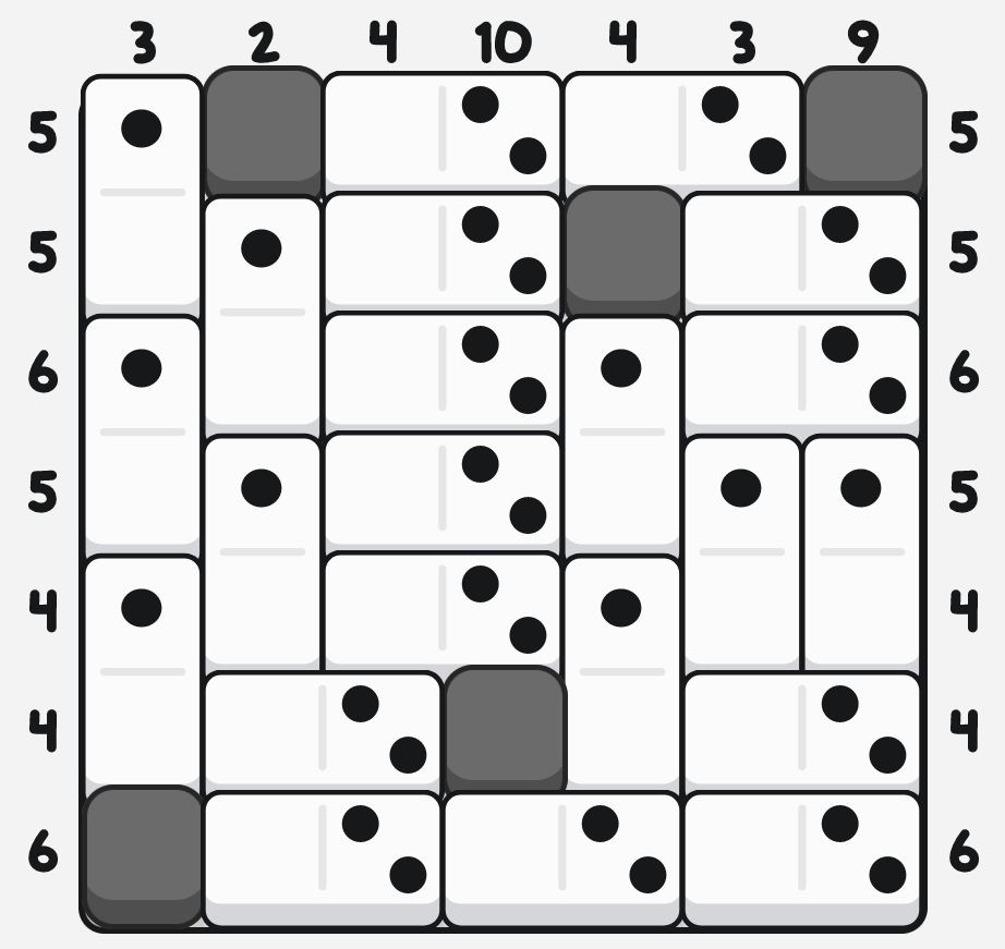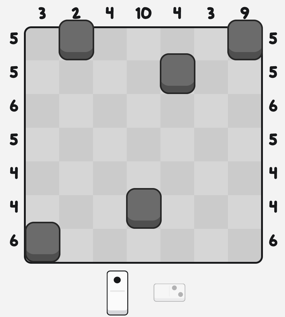 Domino Fit is a domino tiling game, where you have to place dominoes on a board in such a way that the sum of the dots must match row and column numbers. There are two dominoes: a one-dot vertical domino and a two-dot horizontal domino. Dominoes may not be rotated. There are also a few black squares on which dominoes may not be placed. The board in its initial and solved states looks like this: